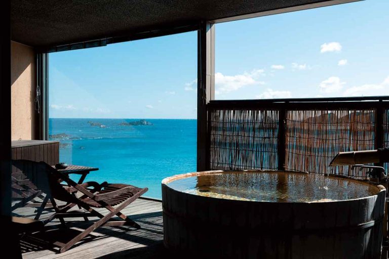 美しい海を望む絶景と、全室に備えられた源泉掛け流しの露天風呂が魅力の、まさに大人の隠れ家